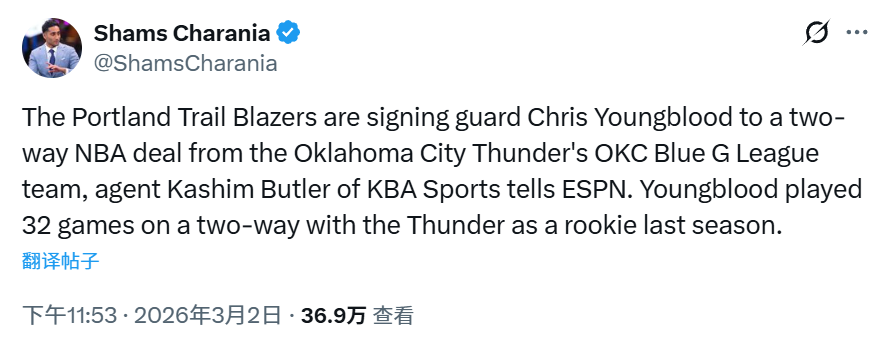另据名记Shams报道,开拓者队与新秀后卫克里斯-扬布拉德达成一份双向合同。